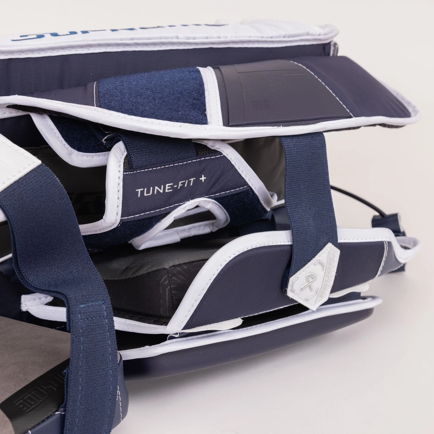 Bauer has tweaked their leg channel and strapping for this new Supreme pad. Tune-Fit+ is the result of multiple generations of refinement of the Tune-Fit system. This iteration features a V-shaped strap that is a fixed size but is adjustable allowing for that tighter or looser fit. This design better wraps and secures the calf than the previous elastic Y strap that doesn’t give the same level of consistency. The calf wrap itself has been extended offering better coverage while remaining lightweight and malleable through the use of Bauer’s AeroLite foam.