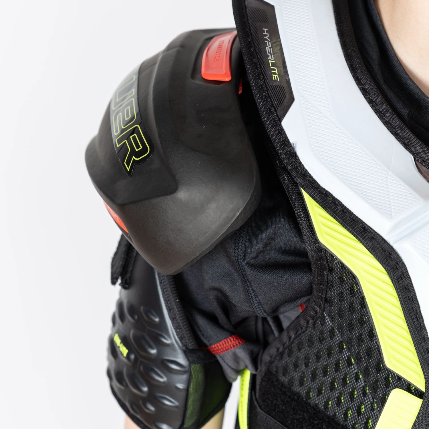 Bauer continues to add more to the Hyperlite line with the Vapor Hyperlite shoulder pads. The design goes above and beyond that of the 2X series while bringing back some of their most reliable tech, including Aerolite shoulder caps and Hyperlite HD foam. The pads also improve in other key areas, particularly with the Thermocore Zero liner, one-piece EXO-Lite skin on the sleeve, and Hyperlite HD foam on the sternum. These pads also come equipped with a Flexaprene vest and enhanced spine and rib protection.