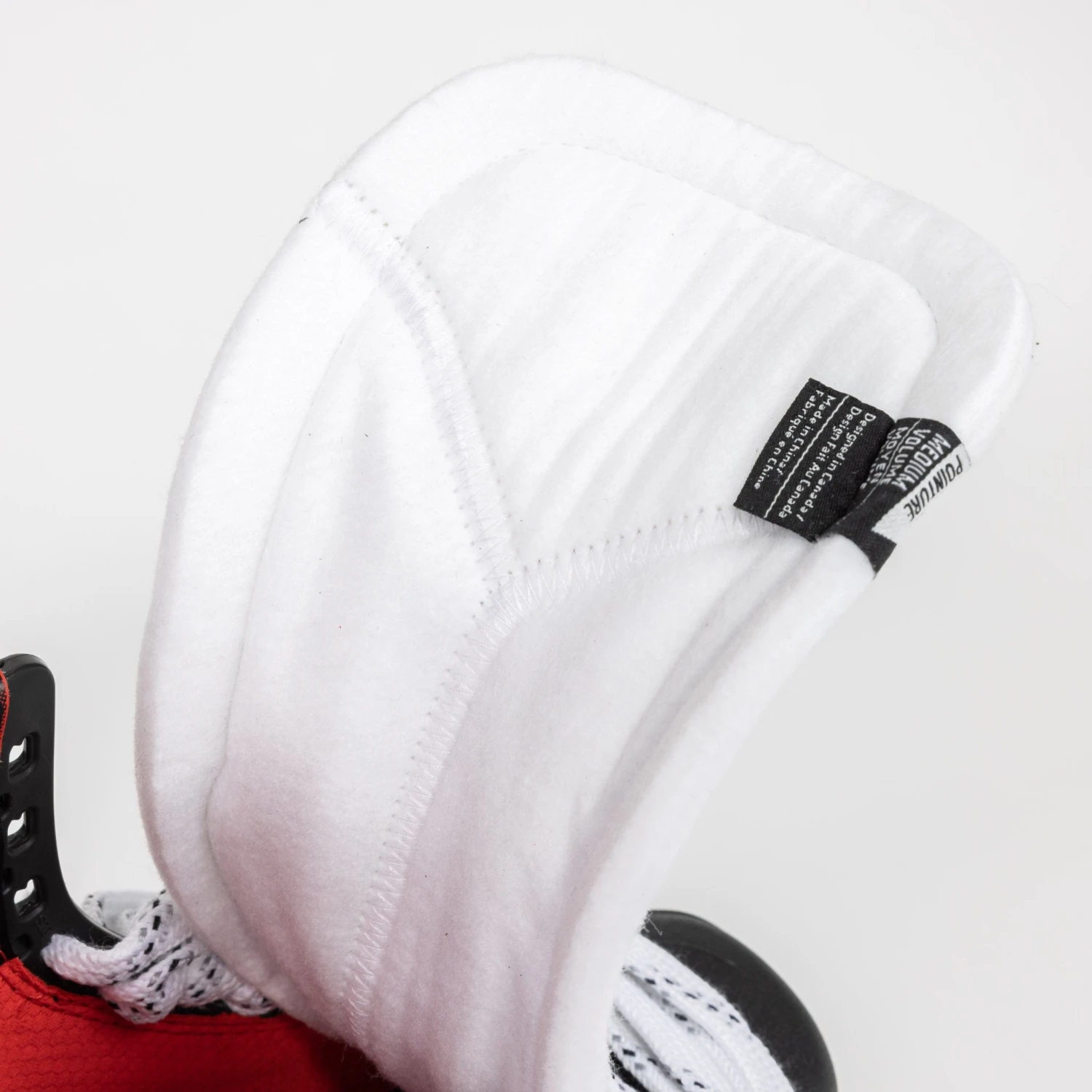 For a better overall fit and to negate any unused space within the boot, Bauer turned to using an asymmetrical toe cap, a concept that has been observed in previous high-end Bauer skates.