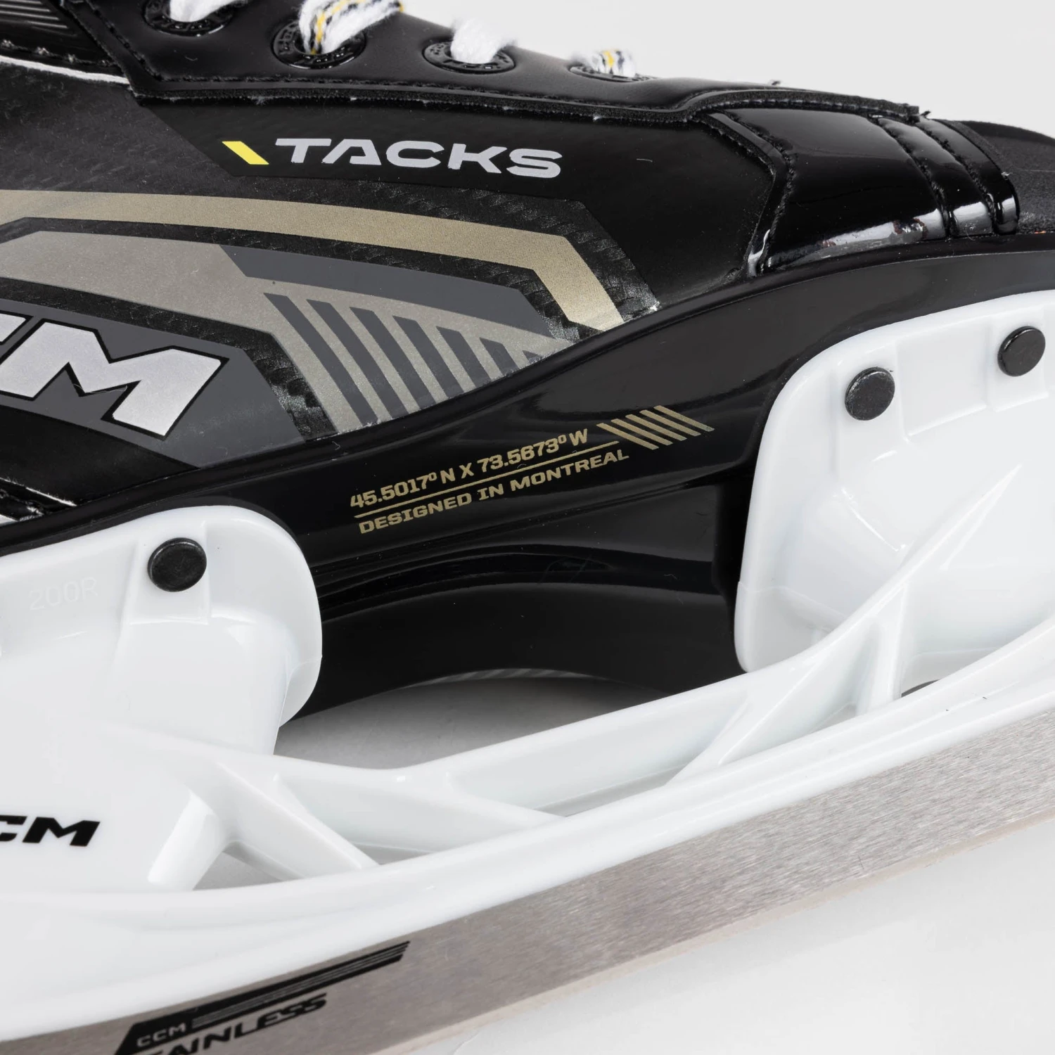 One of the most noticeable updates made to the AS-V was the amended outer design and graphics—exactly like the adult side. CCM rolls out new colours and text logos to represent a fresh start to the line in 2022. In addition to the modern, techy styles on the side of the boot, you’ll also notice the new gold graphics to replace the old yellow, as well as the clean “Tacks” and “AS-V” redesigned logos all throughout.
