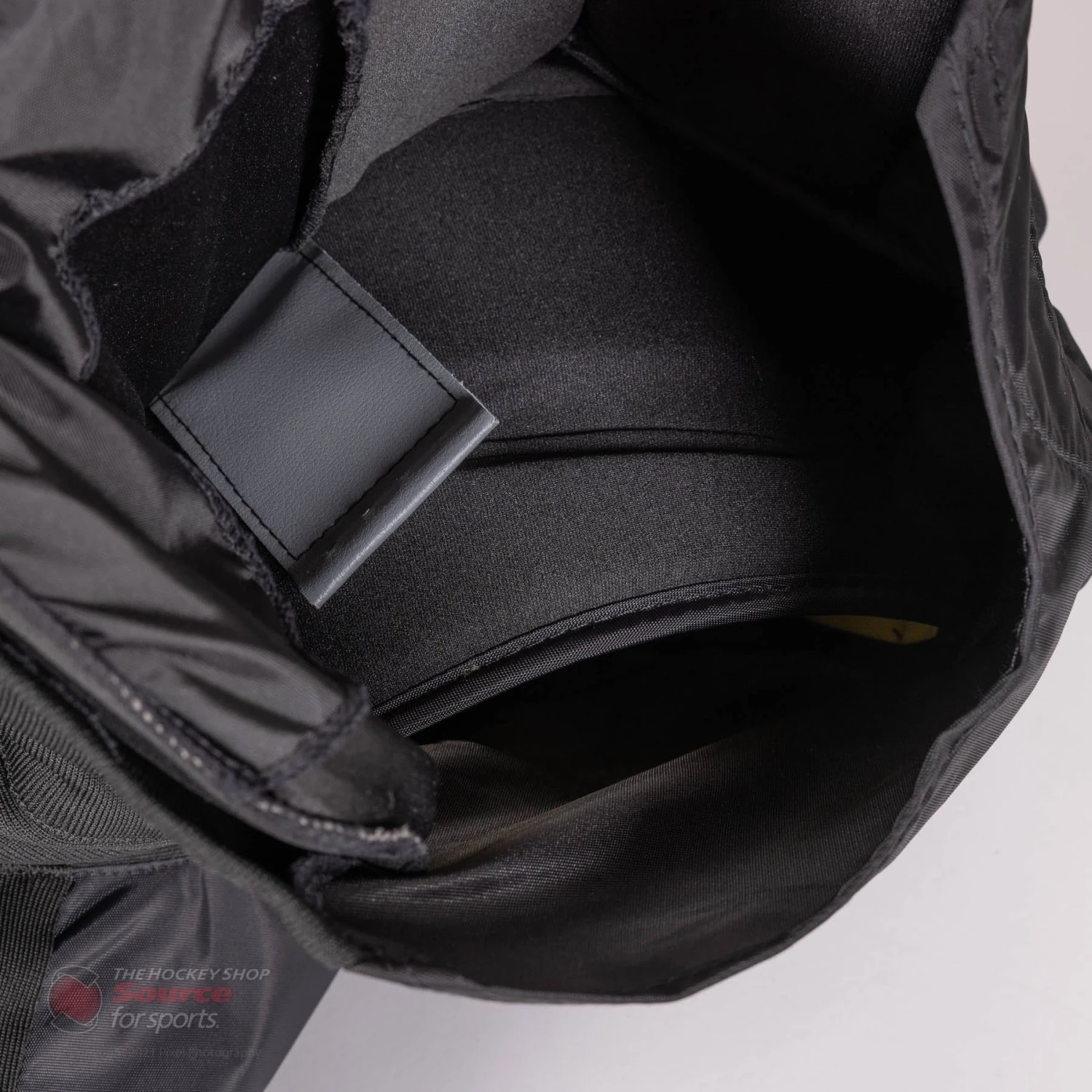 The Warrior Ritual X3 E+ SR Goalie Pants come in sizes S-XXL. For colors, the X3 E+ pant resembles the previous model, black on the outside with Light grey logos and volt lining on the inside.